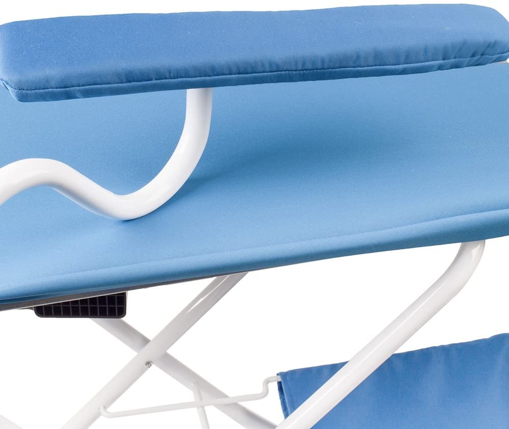 Le plan de travail a une hauteur réglable et le piètement solide lui donne robustesse et stabilité. En dessous du plan, un pratique et large support à linge.