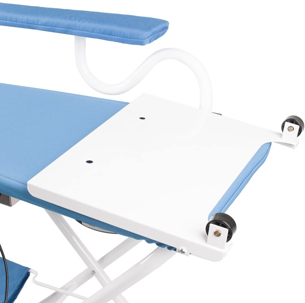 A côté du centre de repassage un solide support de 41,5 x 26 cm pour y déposer la centrale vapeur ou le fer à repasser pourvu de deux roulettes pour faciliter le déplacement et réduire l'encombrement une fois pliée la table et mise verticalement.