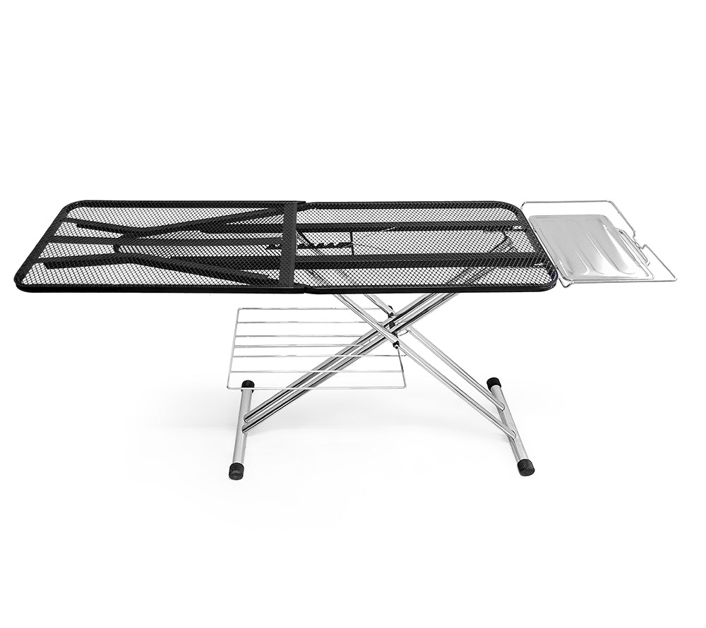 Uno speciale trattamento antiruggine in cataforesi rende il piano di lavoro rinforzato contro la corrosione, resistente alle alte temperature della piastra del ferro da stiro e, pertanto, inalterabile nel tempo.