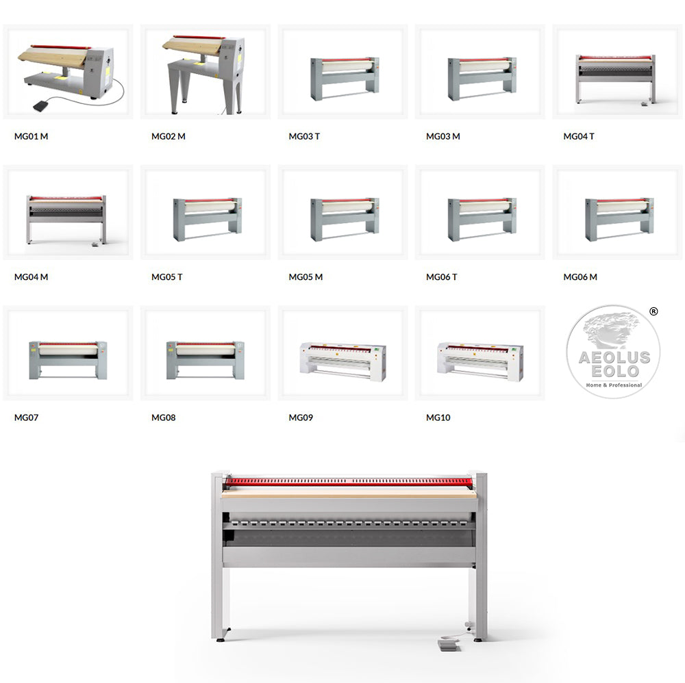 MG03 est équipé d'un thermostat électronique de sécurité qui prévient la surchauffe de la repasseuse, d'une protection thermique pour le motoréducteur, d'une isolation thermique complète pour empêcher la perte de chaleur et le gaspillage d'énergie, et d'une pédale d’arrêt momentané afin de pouvoir étaler le linge sur l'axe d'introduction.