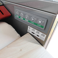 Est fournie d'une axe d'introduction de bois, réglable, pour accélérer et faciliter l'introductions des éléments à repasser selon la position de l’opérateur (assis ou en position debout), et d'une barre protège-doigts qui s'active en cas de mauvaise manipulation en changeant le sens de rotation du cylindre chauffant et en soulevant la cuvette.