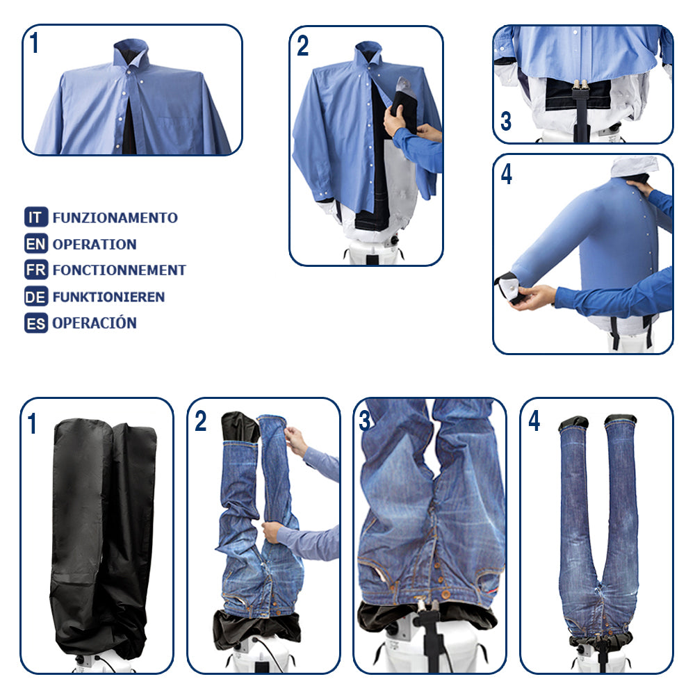 SA05 SP facilite le séchage et le repassage : le jet d'air chaud et la pression générée ainsi à l'intérieur du sac gonflable, sur lequel le vêtement humide est positionné, permettent de défroisser et de sécher automatiquement tout type de tissu, comme le coton, le lin, la flanelle, la soie, mixte (coton - polyester, etc.), chemises à manches courtes ou longues, avec col italien, français, col boutonné ou coréen.