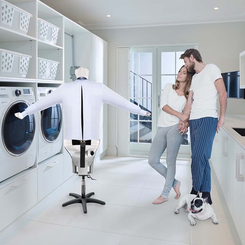 Asciuga e stira contemporaneamente e in automatico indumenti umidi come camicie, camicette, polo, felpe, maglie, t-shirt, pantaloni, jeans, bermuda, tute ginniche dalla taglia XS alla taglia 3XL.