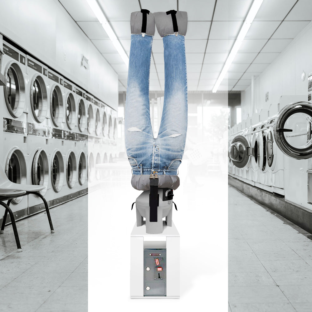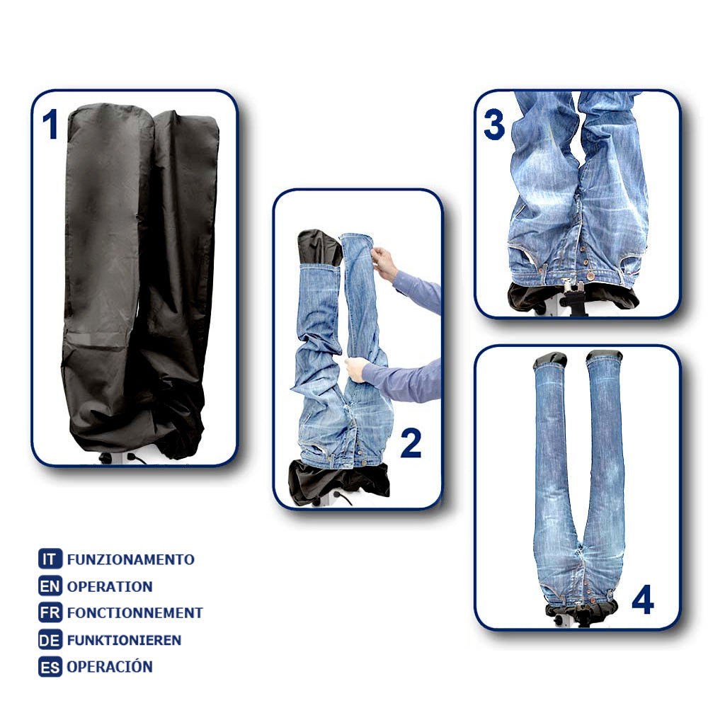 Asciuga e stira contemporaneamente e in automatico indumenti umidi come pantaloni, jeans, bermuda,…dalla taglia XS alla taglia 3XL.