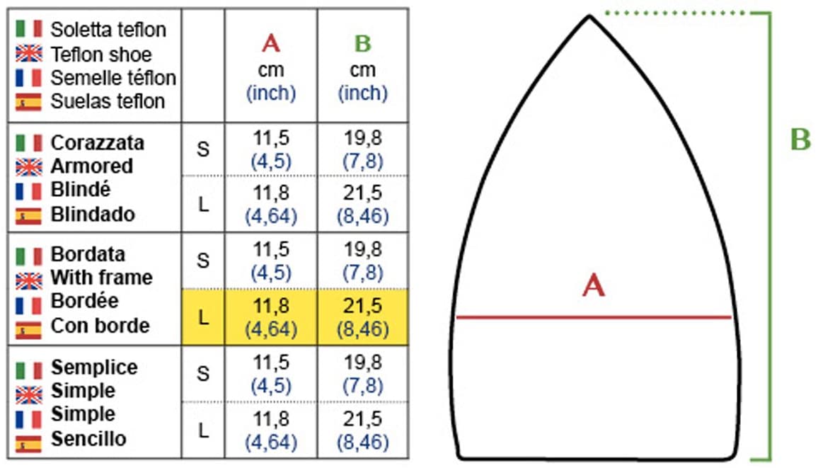 - Semelle teflon à rebord en aluminium Taille L : Longueur 21,5 cm x largeur 11,8 cm (voir le graphique dans les images)