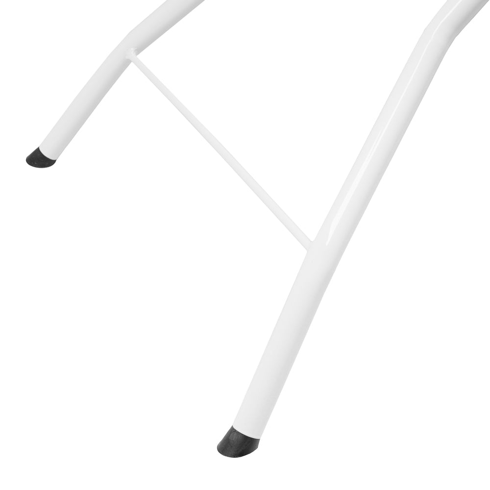 L'altezza del piano di lavoro può essere regolata e l'ottima stabilità dell'asse da stiro è ottenuta grazie alla presenza di un ampio appoggio delle gambe di sostegno, all'interno delle quali si trova il piano poggia indumenti o caldaia con dimensioni 26x100 cm.