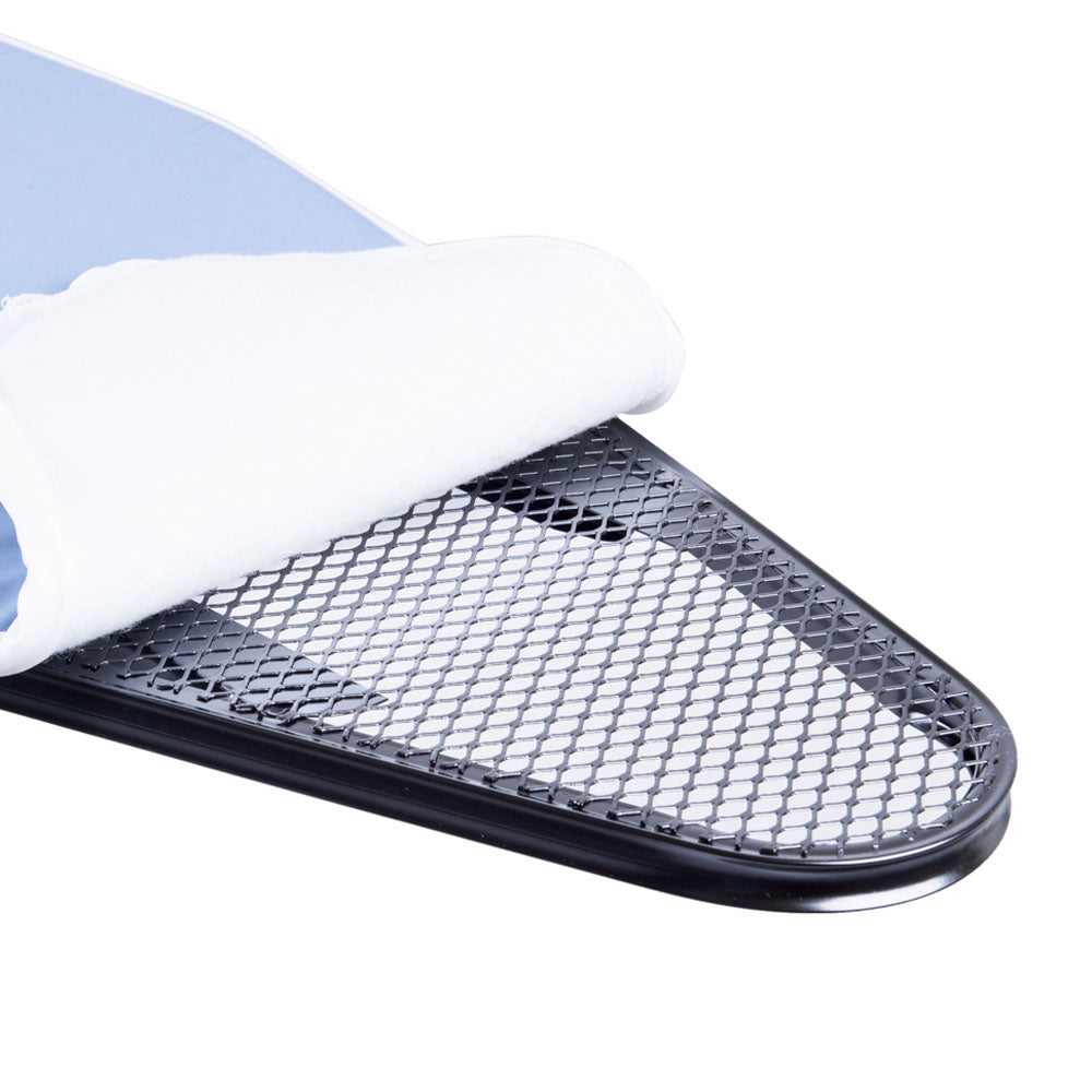 AT05 è dotato di una fodera in flanella ad alta scorrevolezza con mollettone, di un largo piano poggia biancheria e un'altezza del piano da stiro regolabile in 7 posizioni.