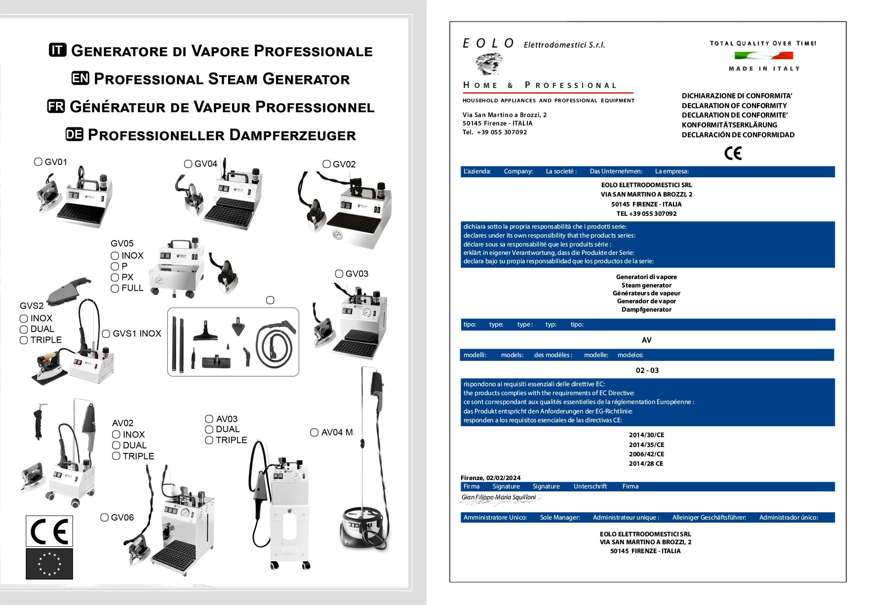 AV02 DUAL INOX, con ricarica semi-automatica, produce vapore secco dopo pochi minuti dall'accensione e possiede un ferro da stiro professionale con paravapore in grado di stirare anche in verticale e una spazzola professionale in grado di vaporizzare, igienizzare, stirare e spazzolare contemporaneamente in qualsiasi posizione che evita rimarcature, lucidature, pettina e toglie i peli facilmente e rapidamente nel rispetto di qualsiasi tipo di tessuto.