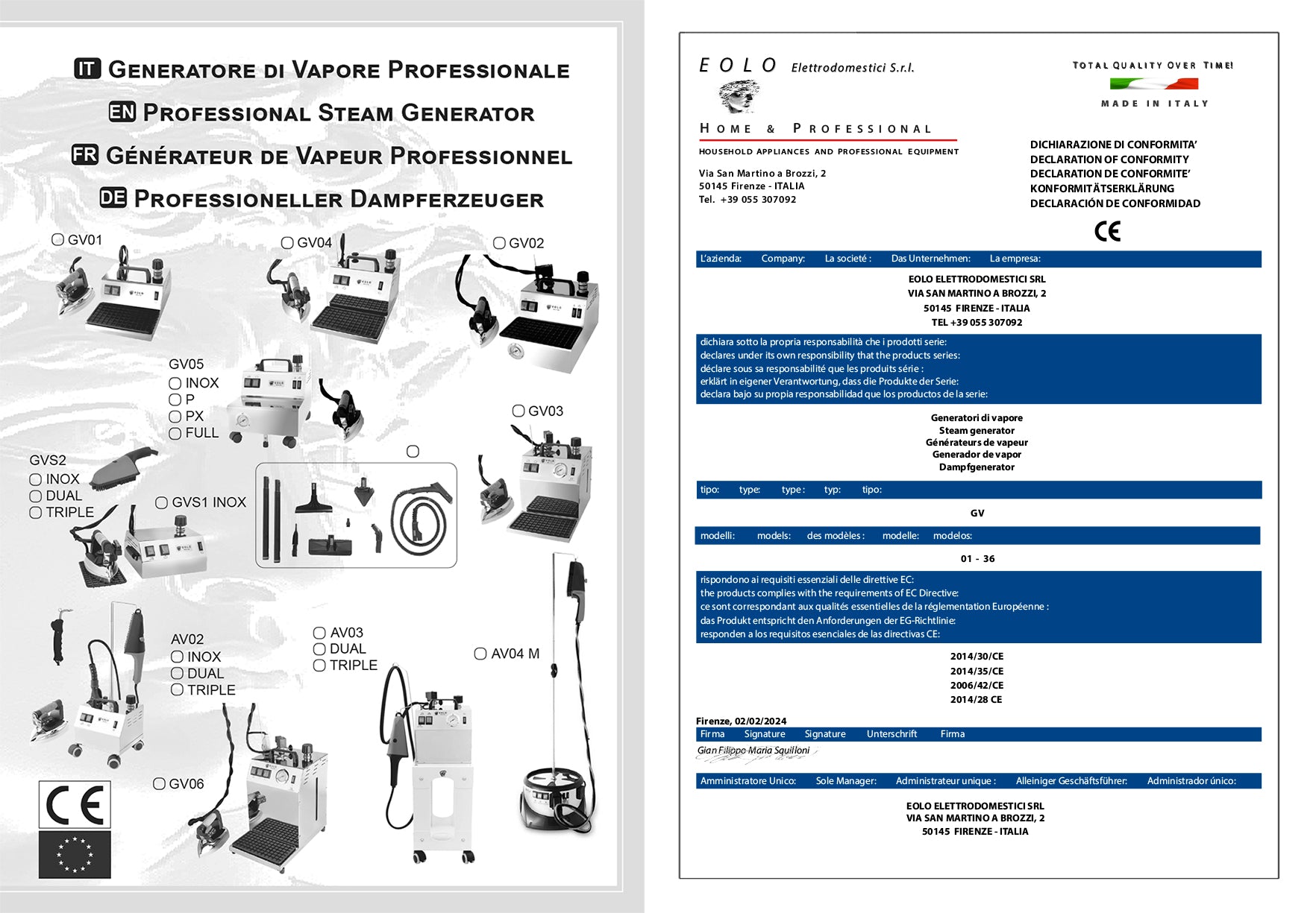 GV04 INOX, con ricarica semi-automatica, produce vapore secco dopo pochi minuti dall'accensione e possiede un ferro da stiro professionale con paravapore da 1,55 Kg in grado di stirare anche in verticale.