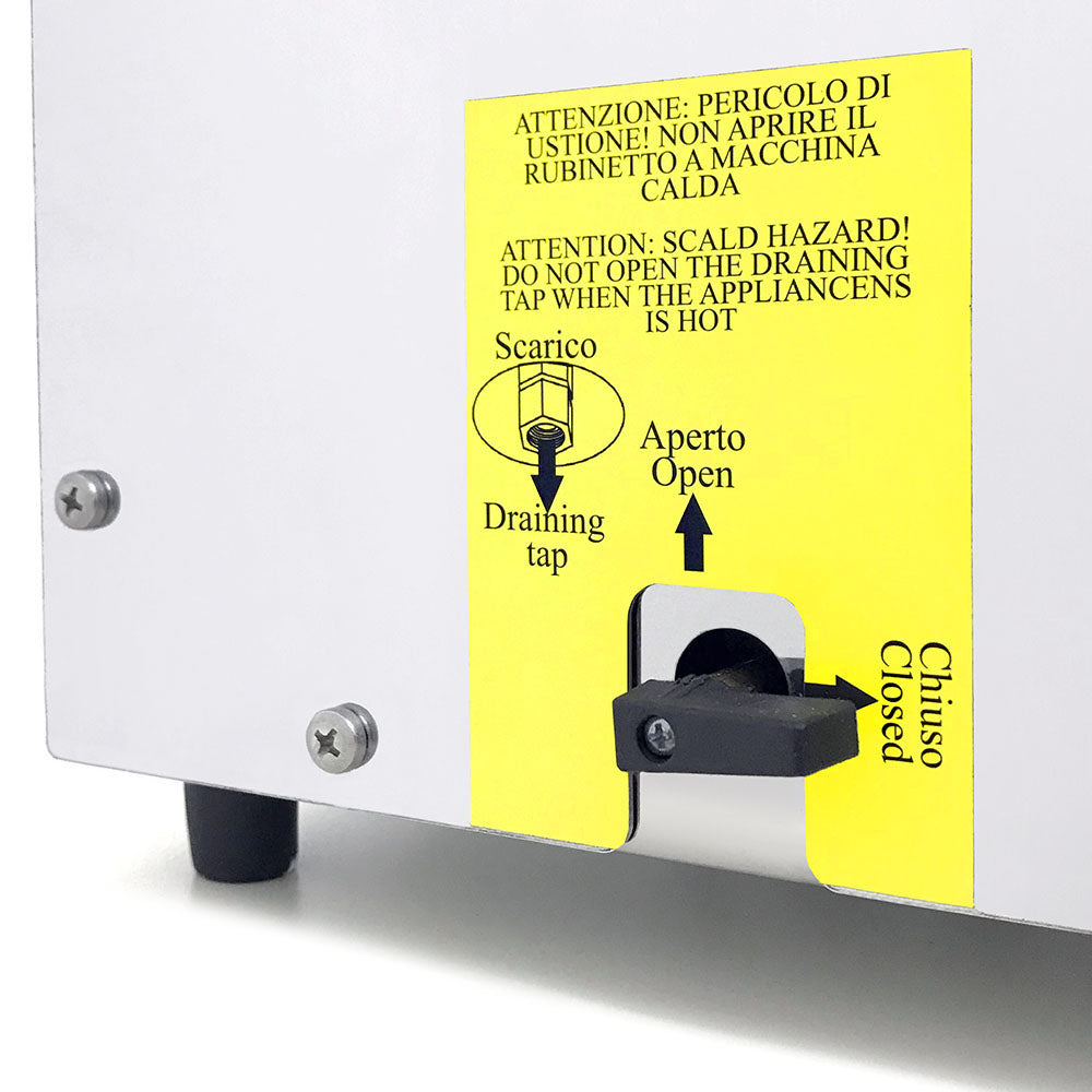 Dotato di pistola a due vie acqua/vapore con beccuccio di precisione con doppio comando: uscita vapore secco e uscita acqua calda a 95°C, e tanica esterna.